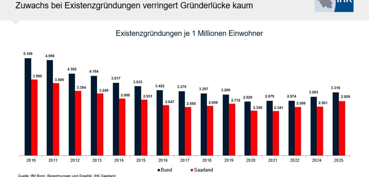 Mit einem Plus von 11,1 Prozent bei 2.882 Neugründungen im Jahr 2025 überholt das Saarland den bundesweiten Zuwachs von 7,2 Prozent deutlich. Programme wie Starter-Stipendium und Business Angels Starterfonds sorgten für zusätzliche finanzielle und fachliche Unterstützung, konnten den im Vergleich zum Bund bestehenden Rückstand von 459 Unternehmen je eine Million Einwohner jedoch nicht vollständig ausgleichen. Die IHK Saarland beriet und begleitete parallel 447 Gründungs- und Nachfolgeprojekte mit professionellem Know-how effizient.